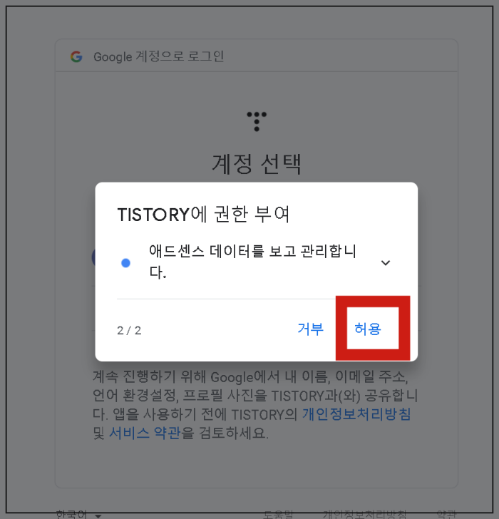 티스토리권한 부여에 "허용" 버튼을 눌러주고, 애드센스 데이터 보고 관리에도 "허용"버튼을 눌러주면 됩니다.
