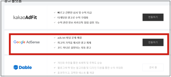 관리모드 수익 카테고리에서, 이렇게 활성화된 버튼이 보이게 됩니다. 카카오에드핏, goole adsense 의 연동하기버튼이 보이는데, goole adsense 버튼을 눌러서, 연동시켜주면 됩니다.